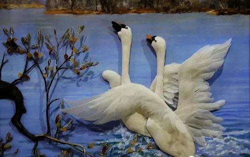 扎兰屯市是呼伦贝尔家禽养殖大市,各种羽毛材料“取之不尽用之不竭”,羽毛画采用优质养殖家禽的羽毛为原料,借用中国国画构图法和雕刻装饰艺术,利用半浮雕艺术造型等加工技术制作而成的工艺图画。工序极其复杂通过收集羽毛、绘画、清洗、消毒、防腐、设计、造型、剪切、粘贴、清理、堆叠、装裱等十几道工艺精制而成。其特点永不变质,变形,永不褪色。表现内容为山水、人物、花卉、飞禽走兽、鱼虫等逼真形象,格调清新典雅,雍容大气,画面将以半浮雕形态表现出呼伦贝尔绚丽多彩的大自然神韵,美不胜收。