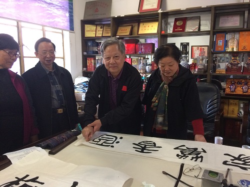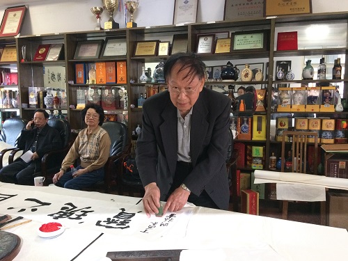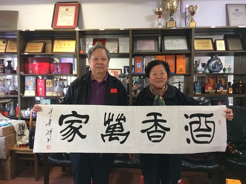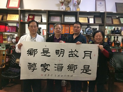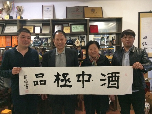 原中煤集团董事长、中国保健协会原副理事长卫国福教授(左2)为梅兰春酒厂题赠墨宝“酒中极品”