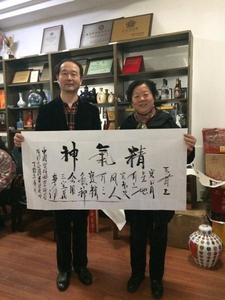 中国管理科学研究院田志强院长(左)向泰州梅兰春酒厂董事长、江苏省食品行业优秀企业家刘秀兰女士(右)题赠墨宝“精气神”