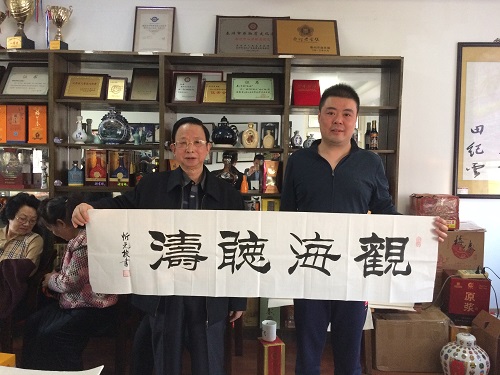 原交通部副部长忻元校(左)向梅兰春酒厂总经理赵巍(右)题赠墨宝“观海听涛”