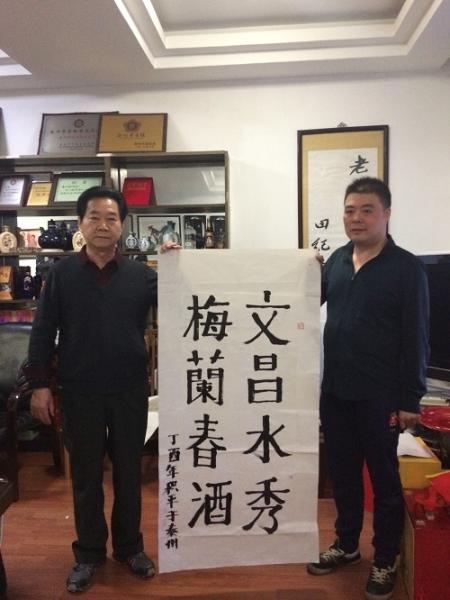 海军航空兵后勤和装备部原政委祁荣祥将军(左2)向泰州梅兰春酒厂题赠墨宝“月是故乡明 酒是家乡醇”