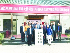 4月2日,在位于天坛东门的燕京书画社大院,尼泊尔驻华大使利拉玛尼鲍达尔先生来到了“老友情怀·共筑中国梦——大吉之展”的展览现场,与燕京书画社艺术家们一起交流书画艺术,并在燕京书画社总经理石占成和副总经理赵青仲的陪同下,参观了这家有着近40年历史的老字号艺术机构,让大使先生初步了解了燕京的历史,了解了中国的书画艺术。 今年是燕京书画社成立38周年,在正在展出的大吉之展展厅内,石占成向大使先生详细介绍了画展作品,借助画展的良好寓意向他表达美好的祝福,随后大使先生又分别参观了燕京书画社艺术家创作室和青少年艺术培训教室,感受到了燕京良好的艺术氛围。 参观结束后,燕京书画社艺术家现场创作书画作品,向大使先生展示中国书画的创作技巧。郭印良、马春林、赵路、魏文侠等书画家分别把创作的作品赠送给了大使先生,并介绍了每幅作品的涵义。大使先生对燕京书画社成员的艺术造诣高度赞赏。大使先生希望书画社能够成为两国友谊的文化使者,并盛情邀请书画社的艺术家去尼泊尔交流访问。