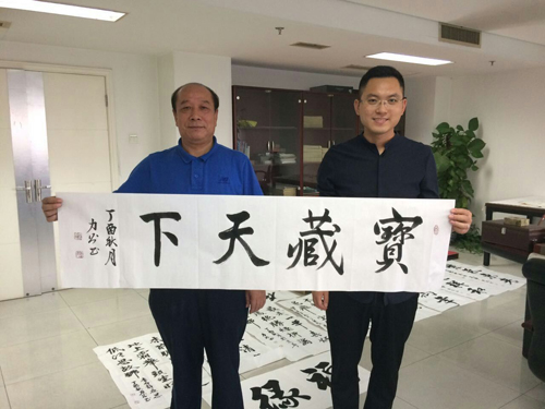 书法家周春华(左)创作的“宝藏天下”书法作品被北京宝藏天下艺术馆馆长高渡先生(右)收藏