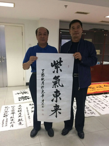 书法家周春华(左)创作的“紫气东来”书法作品被军旅书法家李清虎大校(右)收藏