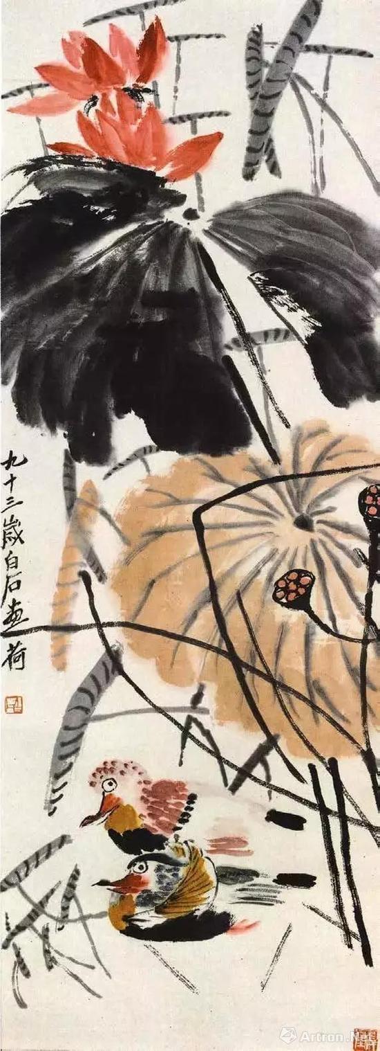 后来作假是怎么回事呢?这里有一个真实的例子,六十年代的时候,不提是谁了,有一张齐白石的画。齐白石有时爱写两个款,他原来已有一个款了,比如“三百石印富翁齐白石于京华×× 年”。这一个款盖上图章了,有的时候像南纸店、荣宝斋、清一阁都挂笔单,挂笔单之后,这张画某某买了,说请您写上我的上款得了,就又拿去,有时候再加字不合适了,就在旁边写上一个某某先生属白石老人又记或者又题。还有的本身就写着“多子”两篆字,底下写白石老人并篆,底下再落一行款,这种情况都有。一幅画双款,两个本人的款,这在齐白石的作品当中经常见到。我见的这张,他把其中的一个款挖下来,画了一张齐白石的四尺墨荷,把挖下来的这个款挪到这张四尺整纸上,荷花好摹呀,荷花净是杆子,这杆子齐着模线一挖,把纸一拼,一抖起纸毛来就齐了。光看字,真的是齐白石,画的只能说不太好,但是一般人也看不出来了。我个人觉得齐白石的字比画难模仿。这种就属于后来造假。造假的手法多了,下面再具体讲。