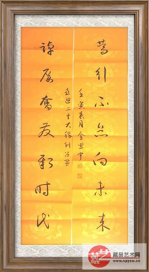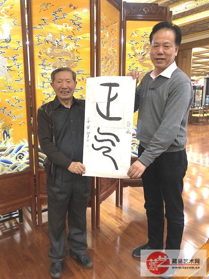 10月13日,金思宇向中央政法委原副秘书长王景荣同志(左)赠送其书写的“正气”作品