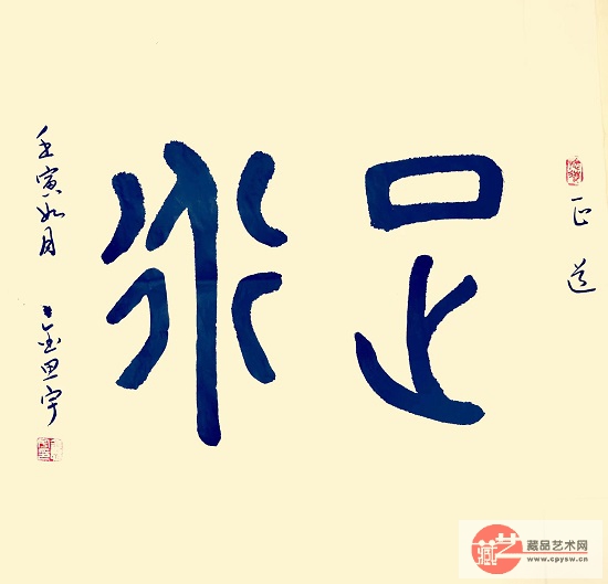 虽然我看到金思宇先生的篆体书法作品不多,但每一幅都是深思熟虑后的精品力作。《虎》、《福由心造》、《虎啸》、《无我》等作品是其代表作。在这些作品中,金思宇多用圆笔,线条也以圆转为多,圆曲中有劲直,变化灵活。结构沉稳又有变化,有俯有仰,古人称之为“龙德”。总体看有味、有劲,站得住,立得稳。最为关键的是有法度。我的老师启功先生在课堂上多次提到一位叫冯公度的人,冯说启功先生的草书好是因为他懂得草书。俗话说得好:“外行看热闹,内行看门道”。同样的道理,懂得篆书才能写好篆书,“篆书出了格,神仙不认识”。金思宇先生是资深学者,多年从事甲骨文、石鼓文、金文和大小篆的硏究,取法吴大澂、邓石如、吴昌硕的篆书笔法,并虚心受教于言恭达、包俊宜等老师,对古文字颇有研究,对篆书的悟性甚高,无愧于学者型书法家的赞誉。