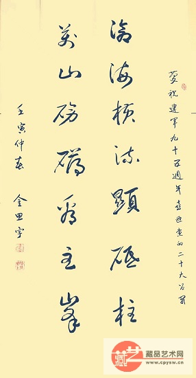 金思宇先生,字德生,号高原雄狮,1963年8月出生,江苏常熟人,教授,高级硏究员,国家一级书法师。多年来,作品获奖无数,人品备受赞许,可谓德艺双馨,艺坛明星。如,2020年被授予 “新时代文艺先锋人物” 荣誉称号,2021年入选“中国当代百名优秀品牌艺术家”,2022年被授予“中华人民共和国书法大家”称号。