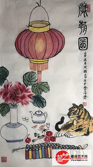 “千百年来国人屈从于道儒释,已然成为自觉状态下民族成长的文化心理走势,这是一个相当富有祈祷价值的话题。所以我常常地在想:艺术良知的建立,要比理想确定更能使绘画艺术从业者走向伟大、走向与平庸决绝。绘画艺术在超度广泛的知识价值系统的过程中,对人类经验都能够加以负责人的考虑,而且必须讲究秩序。“向四时行处见体,于四时生处见用”,在“体”“用”转换与合成的承载中,书画艺术是一个艺术家能够把各种经验内涵加以整合的最好骑手,在整个绘画艺术中,将凌乱的生活整饬为符合一个简单化而又带有普遍真理化法则化的艺术,这是一件极其功德无量之事。如果说吹牛家是最先发明真理的人,那么,艺术家应该是最先发现真理的人——真理只能发现而不可以发明(引自巴子本人《艺术:超感性逻辑的理性法则》)”。腴田如同所有书画艺术家一样,最先发现了艺术真理,所以,他的书画艺术比生活更艺术,比艺术更生活。譬如他的《虎年大吉》,画面构图十分简洁:灯笼、鞭炮、茶壶、瓜子、征年小虎、转头雄鸡,这种意向是一个带有某种残缺性的“年”的完整构图,产生了如同人“身”构件的必要性——没有它的确不行,光有它还是不够。而在着色方面,画家一改意识流作派,正可谓“实色”性也。从笔法上看,画家将小写意与工笔给予了很巧妙的嫁接,形成了融通后的某种禅境默契,让人肯后感到舒坦。就整体笔法而言:平和而不奶气,稳实而不迟滞,既有童趣其间,又有老道味觉,给人留下走不出“年”的缠绵之感,很是亲切真实。