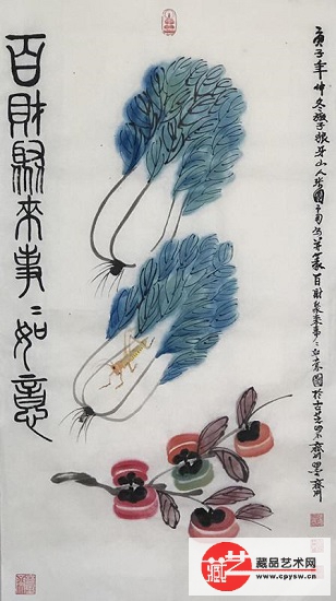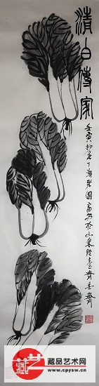 《清白传家》同样是一副艺趣寓横生的好作品——因为,他酝酿了良好的艺术动机。他的“艺”:艺在白描无艳色,似乎从艺术生活中直接把生活搬了过来;他的“趣”:趣在茎叶是简单的勾勒,又随意泼色——介于显白隐黛之间,加之菜帮子的原色调原始自然的烘托,那种原生态的韵味,那种令我不能矜持自已的朴实、甚至带有莫种普世价值的五颗大白菜摆放人们面前;他的“寓”:艺术是一种寓意哲学文化。所谓的寓意即:艺术作品以外的题旨所指:清清白白做人;所谓的哲学即:将爱智慧的淋漓体现,如同在茫茫大海中夜航四面总有灯塔引领一样。所以,《清白传家》立意浅显而蕴含深邃;笔墨稀少而指向浓烈。正可谓:俭约而不简单,神圣而不神秘,不失为一幅很好的作品。所以我说:“一位高明的国画艺术家,他的每幅画都应该让人有新的发现:大气不逼人,精细不腻人,到位亲近人,这便是艺术家在艺术动机驱使下的艺术真诚。何谓艺术真诚?一言以蔽之:艺术家的艺术真诚实质上就是他灵魂的真诚。这个真诚不是别的,它必须是在看破与彻查艺术虚伪本性以后,才能对审美大众真正负起责任的灵魂修养。所以,线与条组装,水与粉的精搭,分与合的统一,情与流的匹配,这都是艺术家必须加持的艺术承接(引自巴子本人《艺术:超感性逻辑的理性法则》)”。诚然,《清白传家》绝在其列。