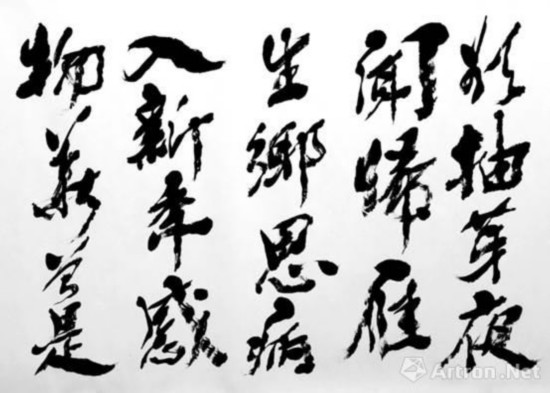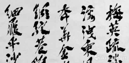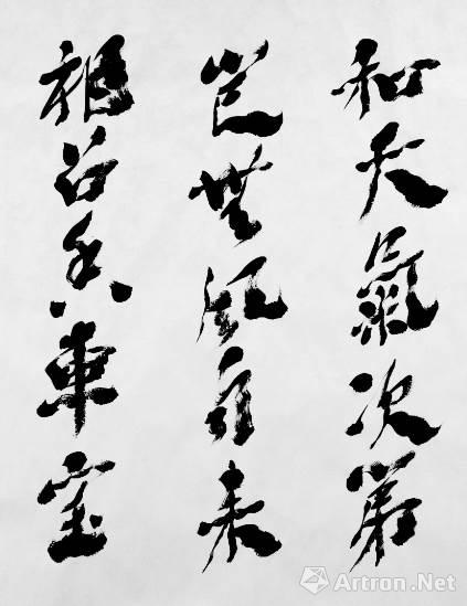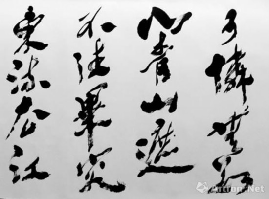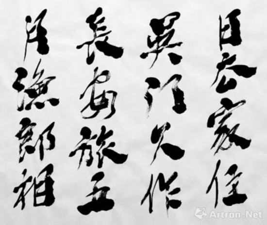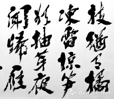 笔墨:能融金文大篆、石鼓、汉碑隶书、魏碑,正、行、章草、大草等各种笔法的优点、灵活自如地运用于书写中,形成既浑厚凝重,又刚健峻拔;既含蓄又奔放,既稚拙又老辣,用笔轻重缓急动静变化大,笔画粗细古润对比强烈而协调。用笔疾涩、方圆、偏正、曲直、尖钝、藏露、平侧锋变化出神入化;用笔多顿挫转折,好出飞白,浑朴苍老,富有金石味,古碑剥蚀味等。善用草书游丝,劲利飞动,婉转而峭拔。善用破笔,绞笔,正侧中偏锋互用。波折、波磔在横、竖、撇、捺中相混用,能积点成线,离而不绝。加之疾涩、波折、波磔笔法并用,使其线条出如虫蚀叶、如虫蚀木、如屋漏痕之笔味,使得笔墨线条含蓄凝练,生辣稚拙,韵润华滋,古朴苍劲;而又能温润秀发,浑厚雄逸,并能时出“干裂秋风、润含春雨”笔墨,从而得遒丽和妍丽、壮美与优美相融之理想笔墨境界。