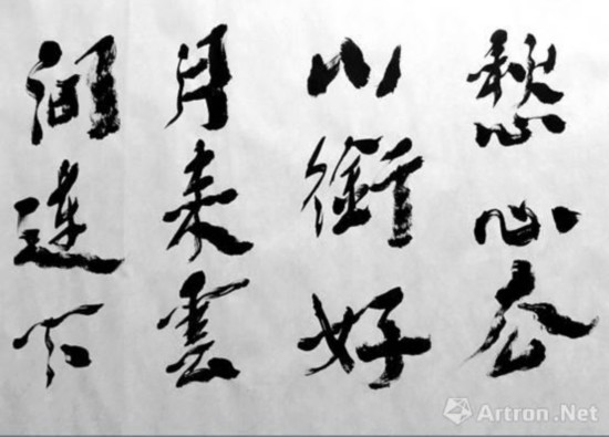 书李白《与夏十二登岳阳楼》、辛弃疾《菩萨蛮 书江西造口壁》,此两幅书其法象:俯仰有仪,方不中矩,圆不副规。笔势峻险苍古,远而望之,若鸿鹄群游,如鹤舞翩跹,络绎飞动,纵肆婀娜;龙腾于川,雨坠于天。流苏悬羽,扬波腾气之势,有如“势来不可止,势去不可遏”之妙。“干裂秋风,润含春雨”笔墨通贯全篇,其笔体金篆隶草真、飞白、八分并用而相混成,笔法方圆兼施,疾涩、藏露、刚柔、平侧、及点线条变化多端而浑然天成,书体结构精绝,雄浑潇洒,奇正相生,大开大合而不逾矩。如其篆味、碑味笔法,气势韵味更为遒丽恢弘,瑰伟岩逸、雄伟疏宕,来自自然而胜于自然,可谓进乎道之境界也。而字体自然奔放,粗细枯润变化有度,阴阳刚柔开阖气势雄逸,错落有致,开阔疏朗,气势恢弘;飞白华美,奇姿百出,得遒丽和妍丽之美,灿烂无比;体式分间布白变化自然多样而相和谐,气脉相承相应,生机勃勃而神采奕奕,真乃当世神品。