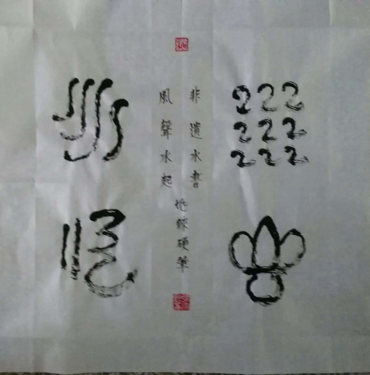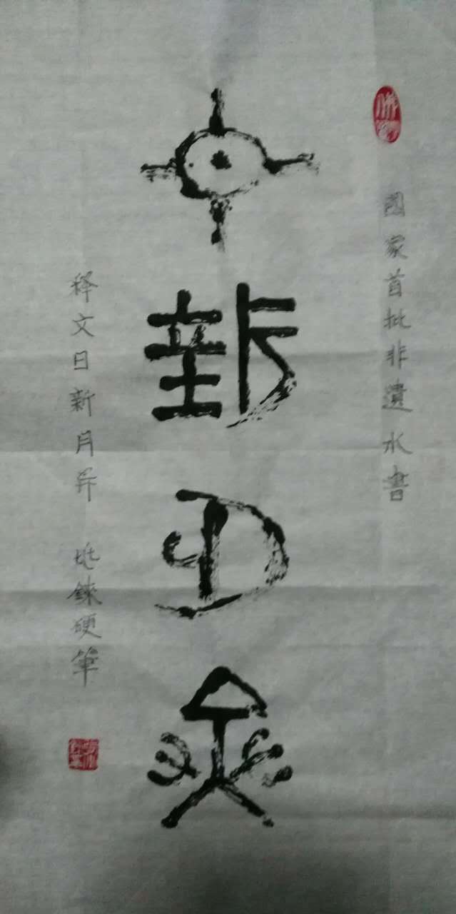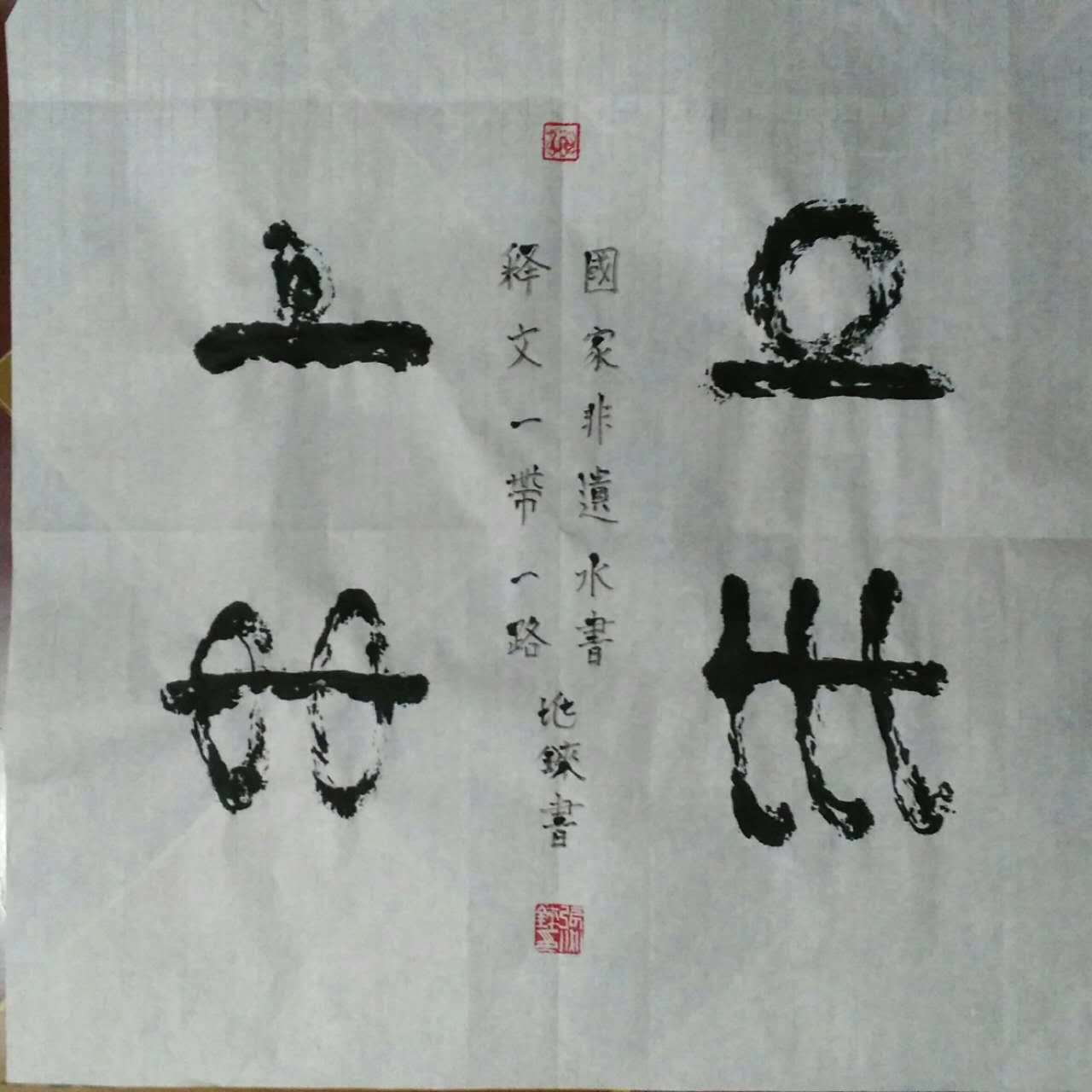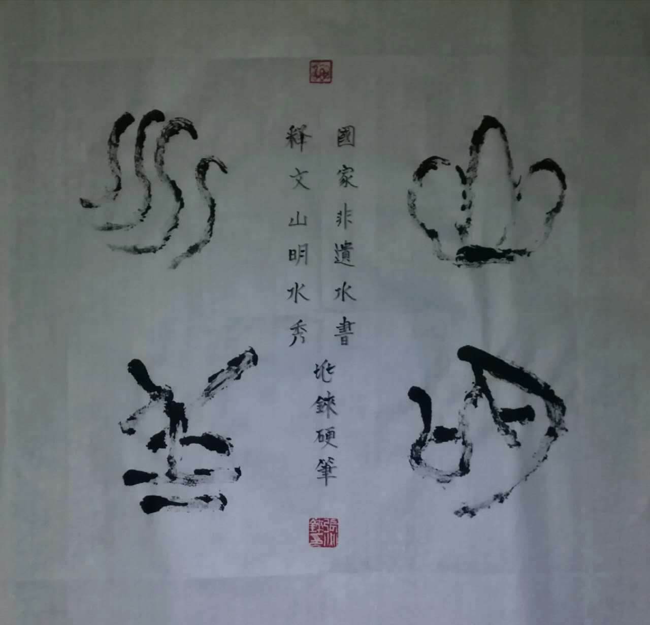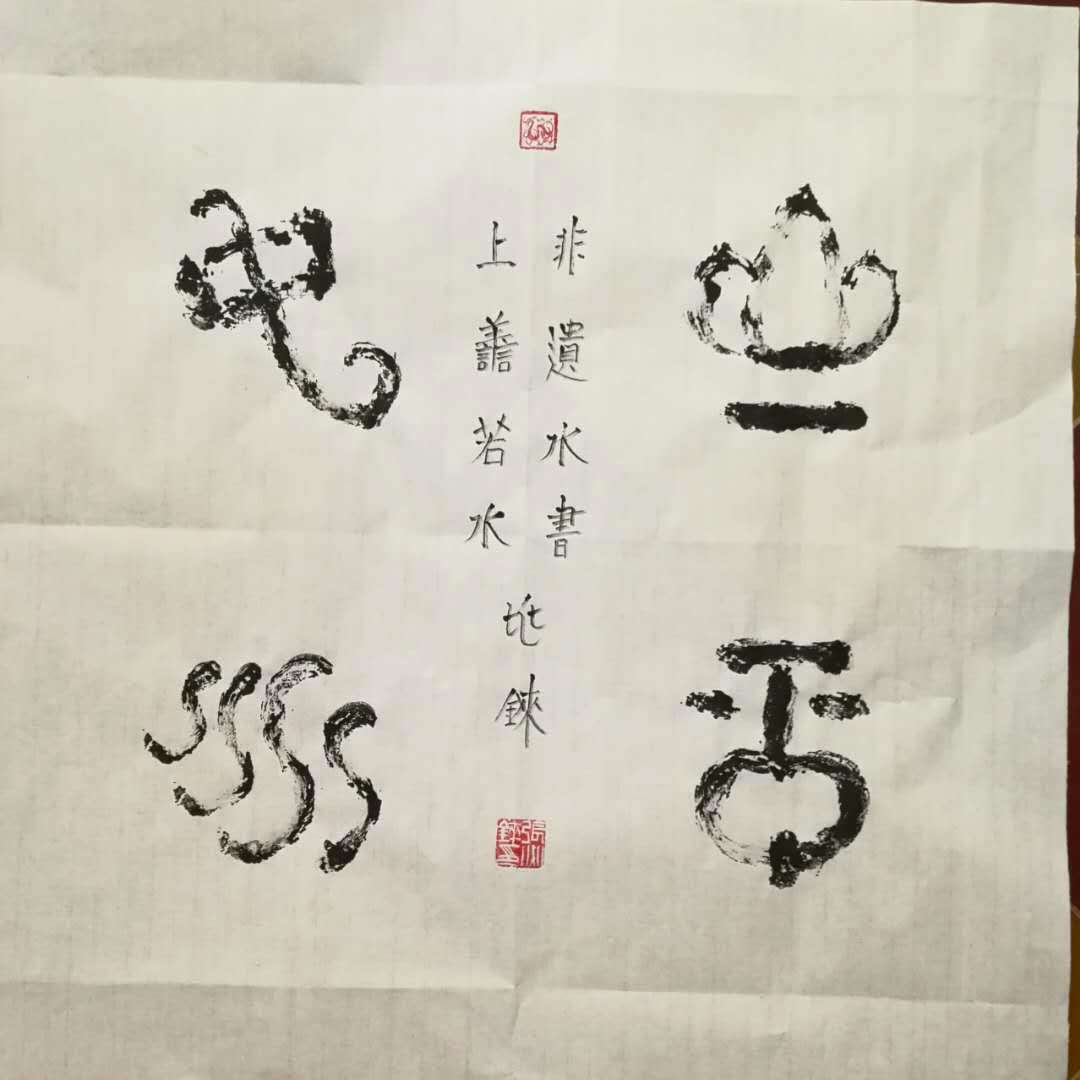 虽”,汉译为水文或水书。水家古文字创造之时代极为古远,可上溯到殷商时代,并与甲骨文、金文有渊源关系。的确,现存数百字的水书仍象汉字早期的甲骨文一样,以象形字、形声字、会意字居多,几乎都停留在类似甲骨文、金文等原始文字阶段。水字尽管是原始文字,水字的书法还在探讨之中.我首先提出水字书法的观念, 如何确定水字书法之主笔?如何掌握水字书法的笔法、字法、墨法和章法.不仅如此,而且使用自制书写工具,书写的水字书法作品入选中国邮政<一带一路>珍藏邮册,入选中美建交37周年<美国名片>邮册,入选中法建交53周年珍藏邮册,并多次在国家级书法大赛中获奖.得到中外有关部门的认可和赞誉. 使频临失传的水族古文字以书法形式得以传承,真乃中国文字之大幸。