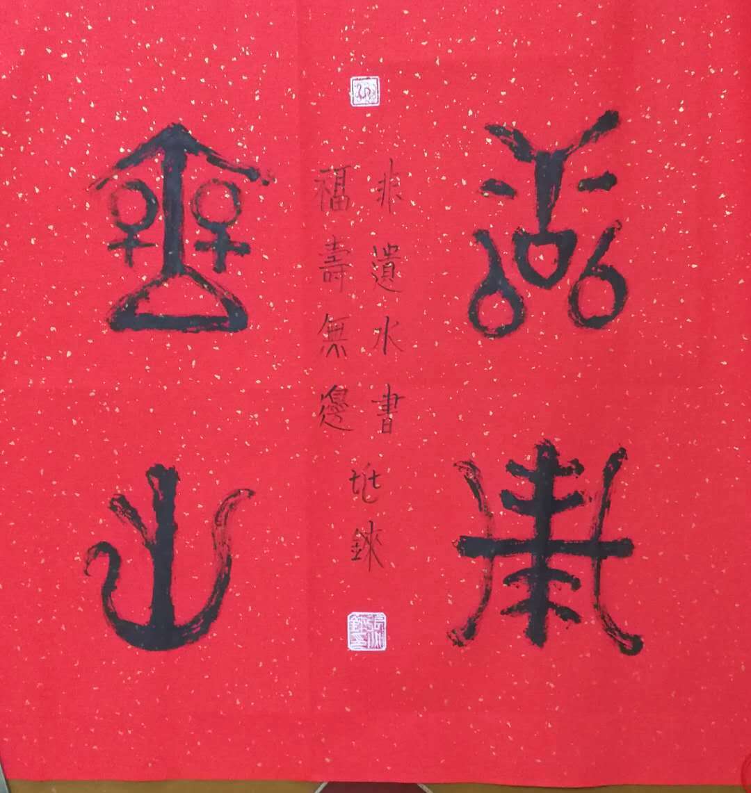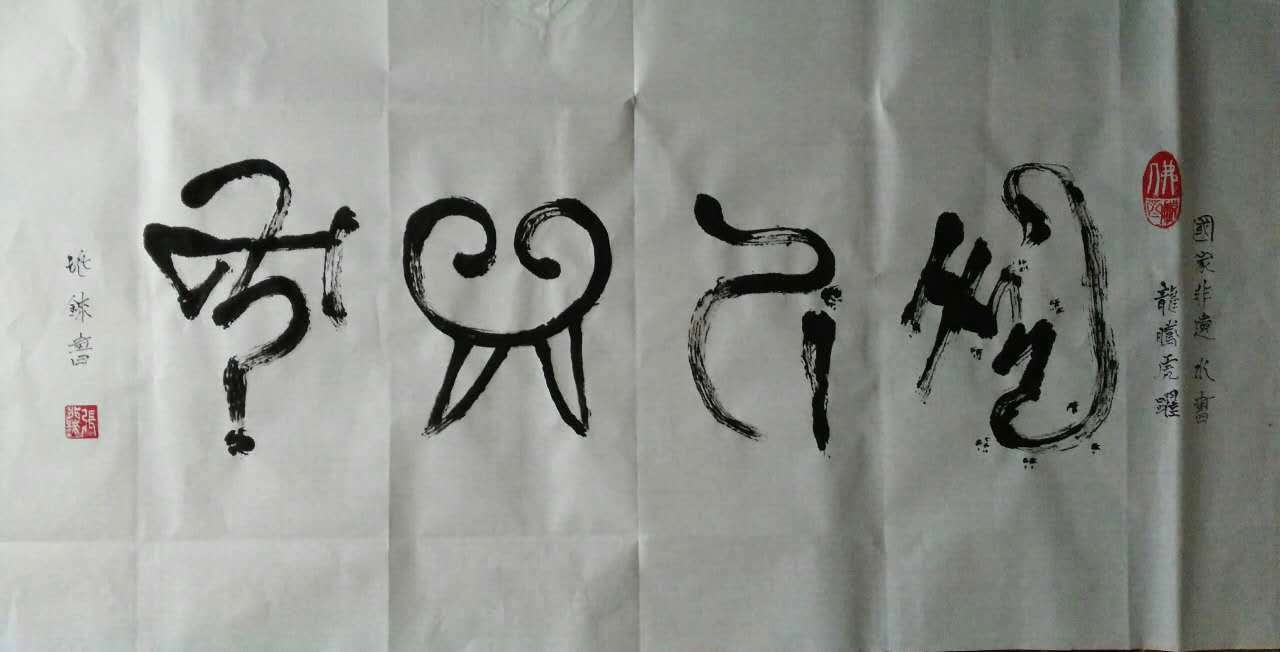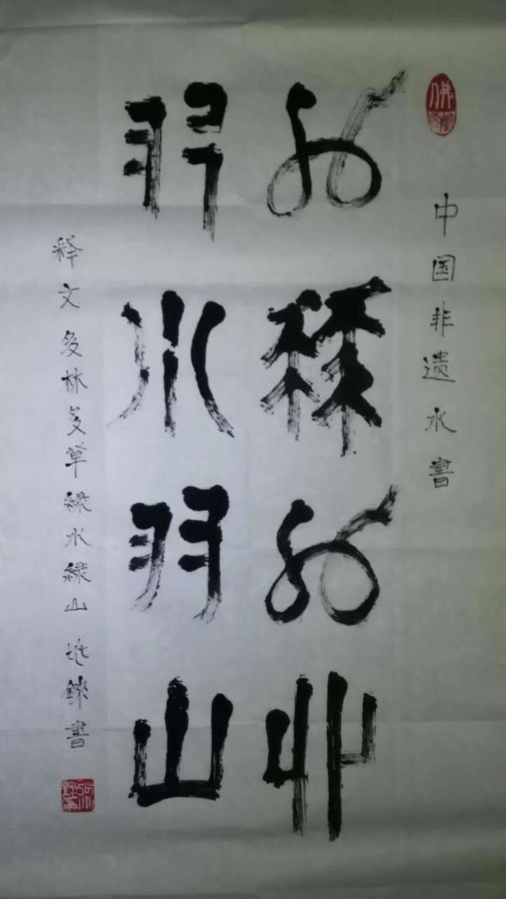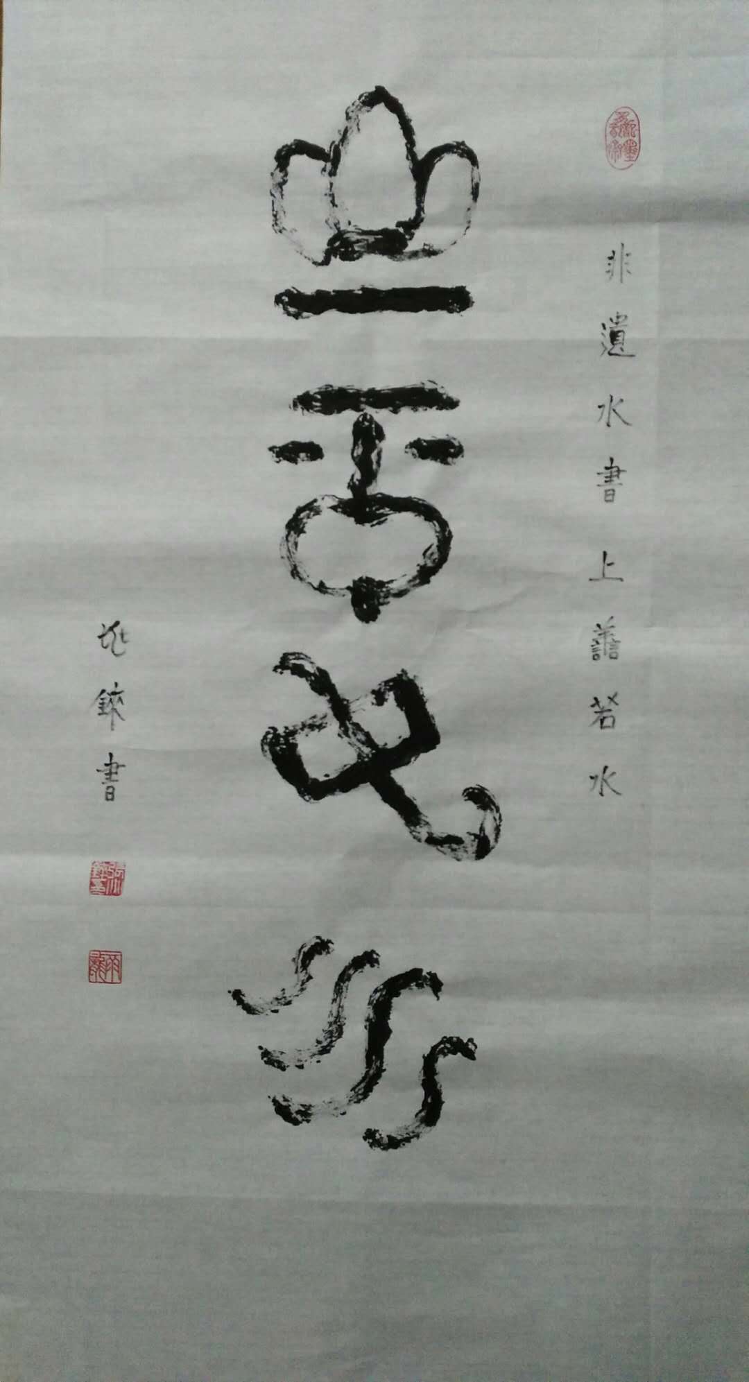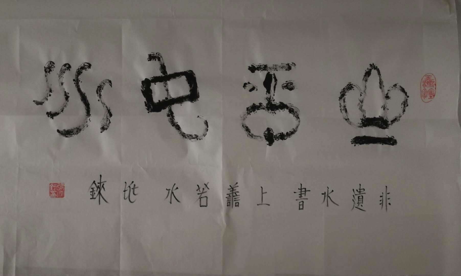 虽”,汉译为水文或水书。水家古文字创造之时代极为古远,可上溯到殷商时代,并与甲骨文、金文有渊源关系。的确,现存数百字的水书仍象汉字早期的甲骨文一样,以象形字、形声字、会意字居多,几乎都停留在类似甲骨文、金文等原始文字阶段。水字尽管是原始文字,水字的书法还在探讨之中.我首先提出水字书法的观念, 如何确定水字书法之主笔?如何掌握水字书法的笔法、字法、墨法和章法.不仅如此,而且使用自制书写工具,书写的水字书法作品入选中国邮政<一带一路>珍藏邮册,入选中美建交37周年<美国名片>邮册,入选中法建交53周年珍藏邮册,并多次在国家级书法大赛中获奖.得到中外有关部门的认可和赞誉. 使频临失传的水族古文字以书法形式得以传承,真乃中国文字之大幸。