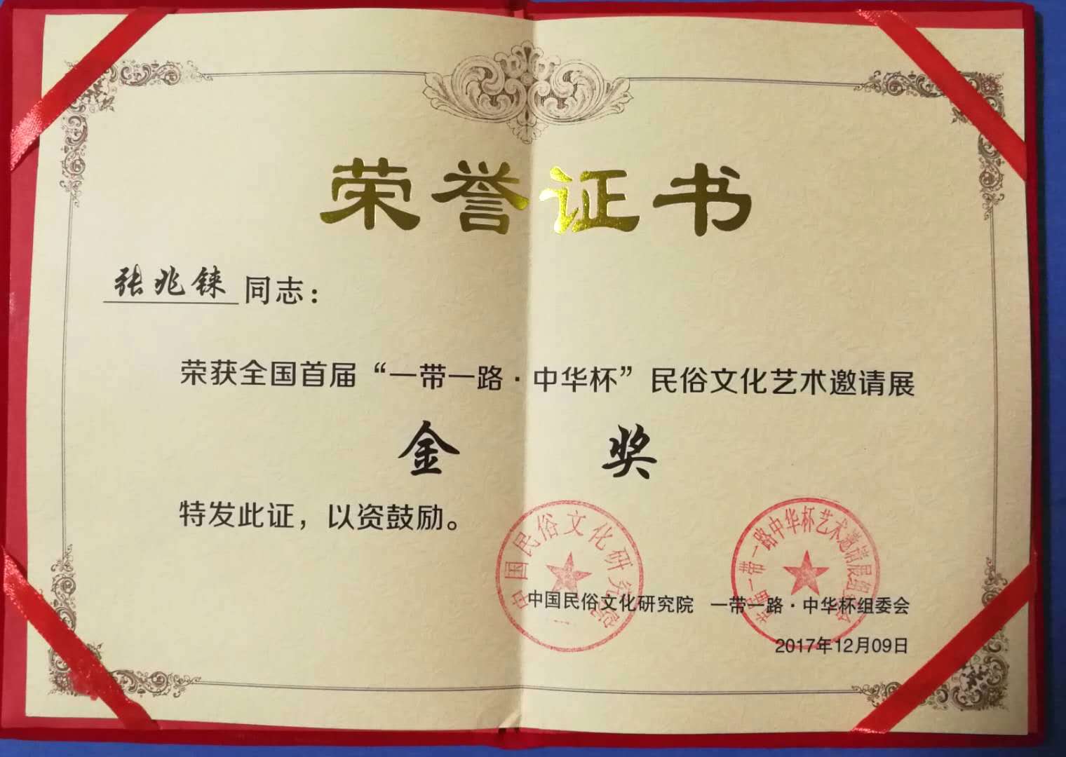 2017年12月荣获全国首届"一带一路.中华杯”民俗文化艺术邀请展金奖。