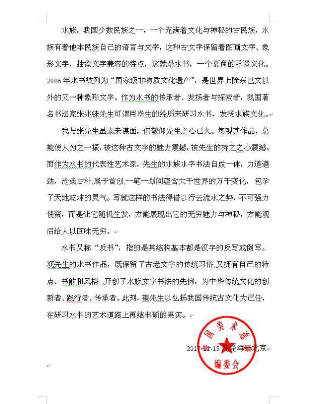2017年11月16日北京画坛刊登<非物质文化遗产水族水字书法艺术>论文.