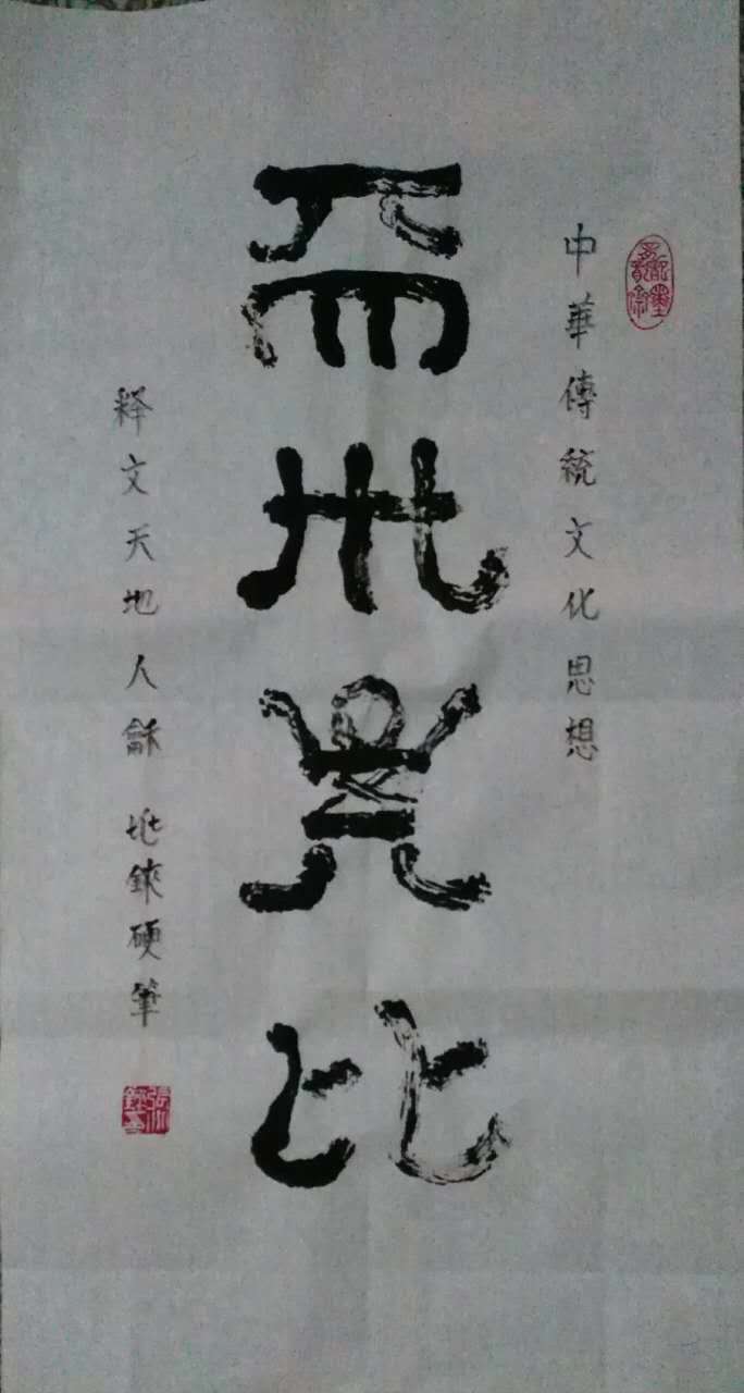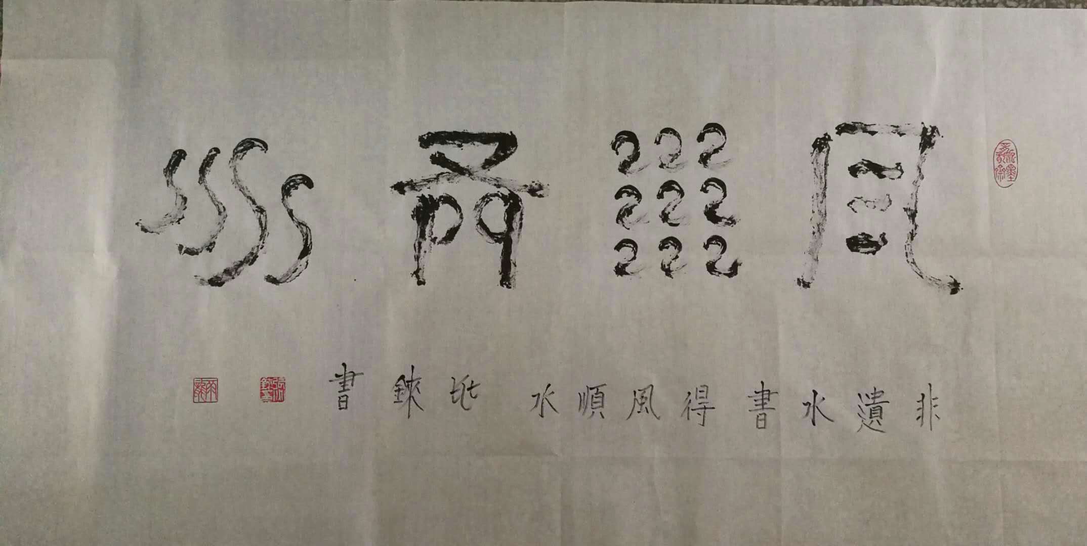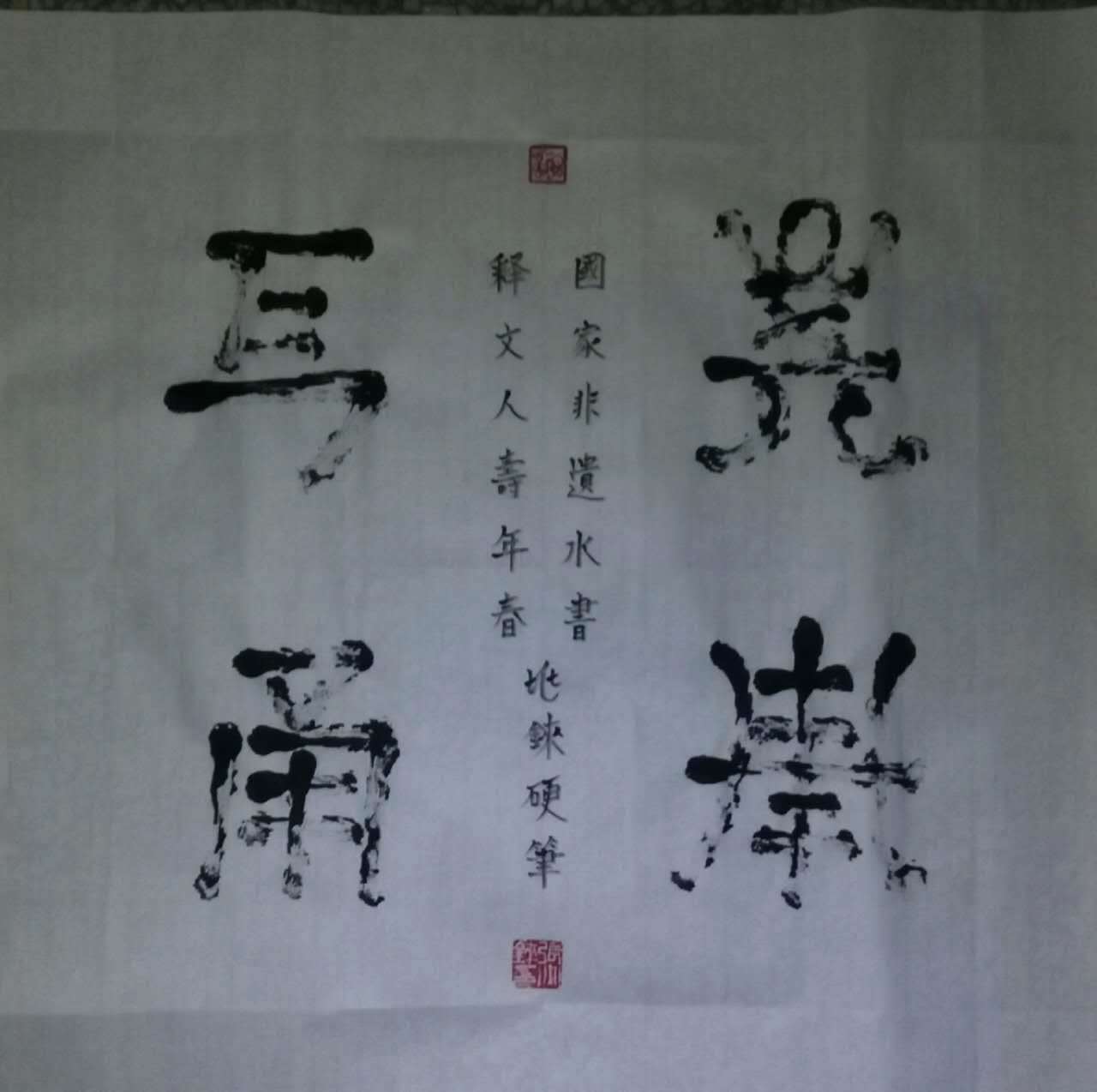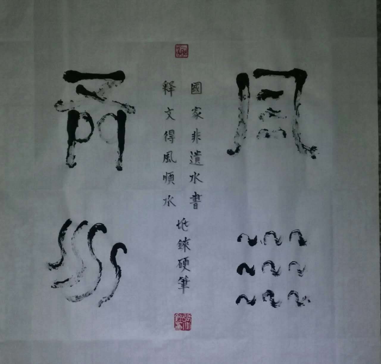 的纤维性较大且强度不高,用现代的硬笔书写很容易将宣纸划伤、划破,尤其是用硬笔写大字更难。我经过多年的潜心研究、自创硬笔并在传统宣纸上写大字书法,尤其是书写传统文化非遗水字书法、女书、西夏文等。这在宣纸书写上是一次突破、创新。打破了几千年的书写传统习惯,从而形成自己的风格,自成一派。即是对传统书法的突破又是对传统书法的传承和发扬光大。将硬笔书写从原来只是用来文字书写变成可登大雅之堂,雅俗共享. 该硬笔在宣纸上自如、流畅书写大字得益于自创的硬笔的设计结构及制笔的材料选用。一般的硬笔(钢笔等)在宣纸上运笔很容易将宣纸划伤划破。尤其是写大字时笔头吸墨较多,笔头与宣纸接触面较大,宣纸吸墨后强度大大下降,很容易将纸面划个口子,导致书写失败。我经过多年的研究,不断探索,反复试验,成功的解决了硬笔写大字时笔尖与宣纸纸面的摩擦力问题,虽是金属笔头,但运笔中的中锋、侧峰的运用,提、捺、按、压的笔法都可随心所欲,顺畅书写。该笔且能将向水字书法、女书、西夏文等文字那种远古、沧桑、遒劲的风格发挥得淋漓尽致,更能体现当初古人书写时的风范和意境,别有一番风味。