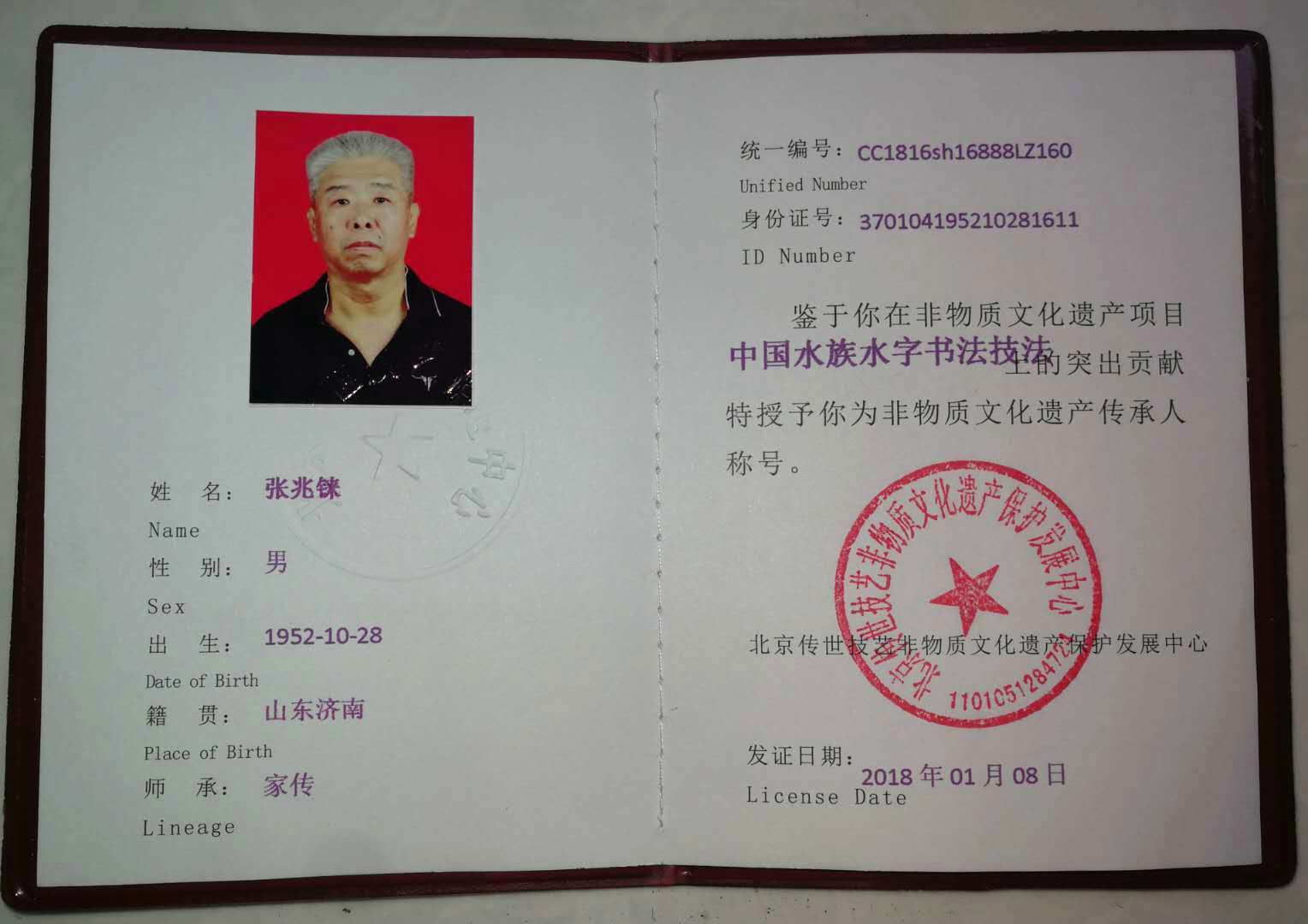 张兆铼,国家非遗水书传承人,中华水族古文字书法家,中美中法杰出华人艺术家, 2017年最具影响力华人艺术家, 文化部艺术人才, 慈善艺术家,英国牛津艺术学院客座教授,济南市工商联会员,中国硬笔书法协会会员,济南市硬笔书法家协会理事,中国民族书画家协会会员,世界华人书画家协会(香港)会员,华夏北海国际书画院中华水书创作室主任,中国东夷书画研究院院士,中国俊彬书画院理事,山东省委老干部老年书画研究会终身会员,济南艺缘书画院分院副院长,藏品艺术网书画艺术委员会会员。青年从师著名书法家张耀峰门下,得到身教真传。
