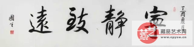 汉字在漫长的演变发展中,一方面起着思想交流、文化继承的社会作用,另一方面在书写应用汉字的过程中,本身又形成了一种独特的造型艺术。这幅书法横幅《宁静致远》,繁体书写,气韵贯通,起承转合,一派自然。这幅书法作品,章法得体,显示了书法家强烈的谋篇布局意识,显现出书法家对汉字源流的熟悉,自如把握,以及对书法意境的追求。