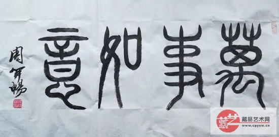 他的书法用笔根清源正,方圆相辅为美,线条流畅为尚,显然与修成两篆之能有很大关系。当下书坛,能尽心潜修篆书的书家已经不多,不修篆书笔法不可全得洞达境界,会有书法先天功力不足的缺憾。精修篆书让周开畅的书法作品,完全不会有失去根源的缺憾,书法用笔成线,总有秦篆的顺滑与坚韧,刚柔能济,倾出收回,节奏成韵律,篆书之成,如古琴铮音,有很强的艺术穿透力。
