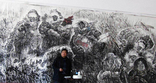 近些年来,我们丧失的东西太多了!我们的环境遭到了破坏,连最基本的水和空气都遭到了污染,精神与民族灵魂受到扭曲!文化也倍受污染!我们不得不反思是什么东西让我们如此糟糕!难道这些都是我们所如愿的吗?这都是金钱惹的祸!是我们被金钱所绑架了。想当年我们坚守的一不怕苦二不怕死、自力更生艰苦奋斗的创业精神创造了奇迹,曾是以铁人王进喜为代表的工人群众,人民大众为中国的工业发展擎起重担,给我们以世界上的骄傲!画家战广彦常年坚守以民族精神为创作动力,坚守艺术的纯洁,在极度艰难的环境下,不被金钱名利所诱惑情况下创作这幅巨作,体现自力更生艰苦奋斗精神的伟大!䅆的上是对时代逆转的反思与呼唤!这是作为一个有良知的艺术家所本该具有的自尊与责任。