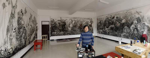 近几年国画都有作品被选入全国性画展,并历时18年时间,创作完成百米大型书画巨幅长卷“大庆石油大会战”,该画卷长达108米,高2.4米,是中国人物画创作领域极具影响力和震撼力的宏幅巨著,在政界、艺术界影响巨大,被众多实力藏家看好。