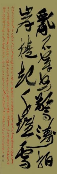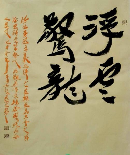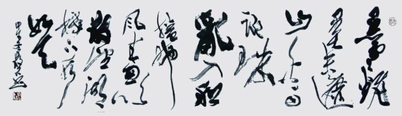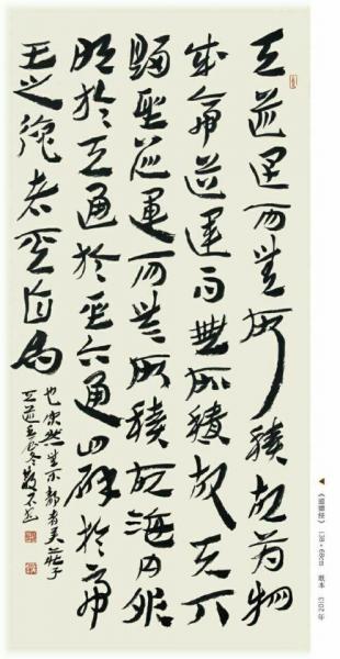 近年潜心研习汉简草书,颇有心得。他将汉简草书的书写溶入了今草,汲取了简牍中的大小错落、今草书中的用笔,形成了简书式的行草书风格,显示出他对汉简书法的体悟能力。能将简书与今草书溶为一体进行书法创作,特别是用汉简草书写榜书,这在当今书坛是为数不多的。
