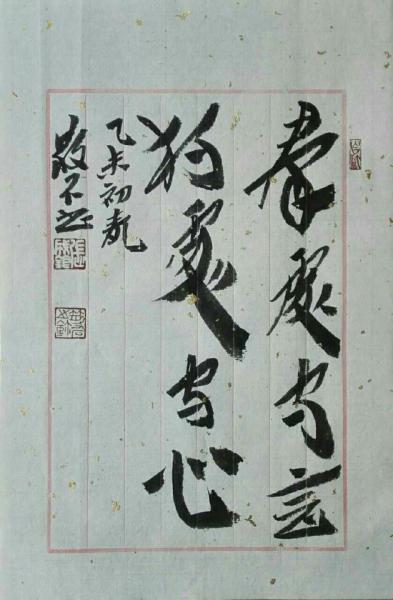 成银君深受古人书艺之浸淫,于墨池耕耘几十春秋,如今,已赢得了阵阵喝彩、束束鲜花,身披无数耀眼光环。这些荣誉的取得,固然与其矢志不渝的追求分不开,但他所怀“琴心”亦不无关联,乃相辅而成。在世风浮躁的时下,成银君不因所动、所扰,静然处之,常怀大慈大爱之心与人相处,敬尊恩师,助携挚友,方便他人,一颦一言、举手投足中所蕴慈爱仁和之意无不在他的笑靥舒眉间流溢。并且,他亦不失文人之洒脱与慈怀,泛舟江湖之雅趣,把酒临风之豪情,悲风叹月之感怀,伤贫悲弱之怜悯,在他身上无不兼有之。因而也铸就了他的书法飘逸、潇洒之灵气。此乃其修心处世之“琴心”也!