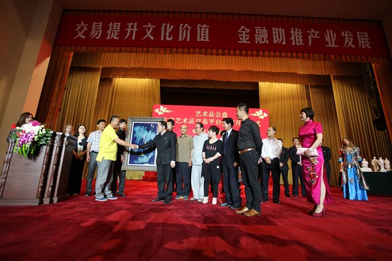 哈尔滨文化产权交易所总裁腾勇(右2)代表国际文化金融交易所联盟接受著名艺术家徐旷达赠送画作