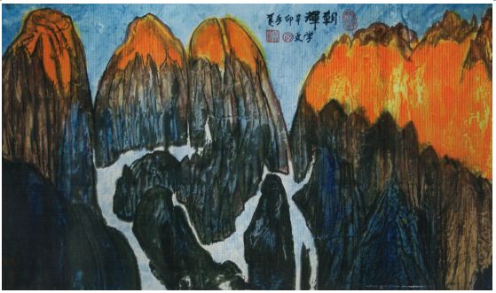 除去令先生引以为傲的书法技艺,于国画方面的成就也是不容小觑的。中国山水色彩画是其主攻方向,山水画历来都是广大文人墨客的最爱,他们用尽笔墨以诗画等形式,展现山水带给人的享受。他坚持扎根祖国,立志在中国的大好河山这片艺术培养沃土上,用色彩画之形式对其传承及展现。国际碑林艺术总监观云先生赞扬其道:“画翰乃大气,品风独新帜,艺林三千树,名畏第一人。”如此之高的评价,绝非“空穴”之言,日积月累的文化积淀,创作技能的磨练是铸成卓就的最基本。