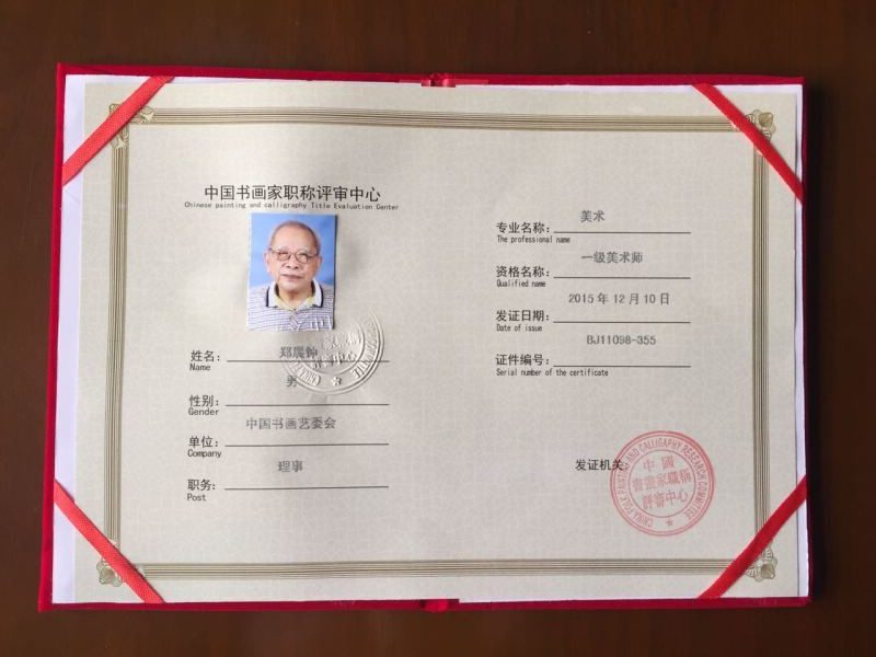 (老书画艺术家郑晨钟被中国书画家职称评审中心评为一级美术师)