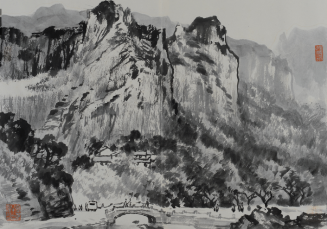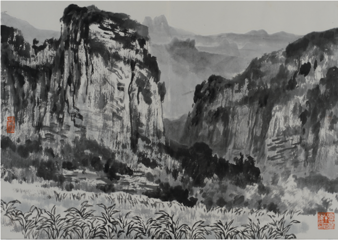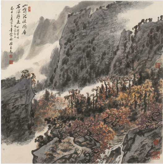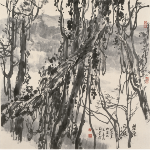 明人董其昌云:“古人运大轴,只三四分合,所以成章。”强调“取势为主”,讲求“画家之妙,全在烟云变灭中”。杜教授的山水画就有此古风,整体质感强烈,得山峦峰崖之敦厚,云水烟岚之放逸,动静相济,气韵生动;且有晦明远近,凹凸虚实之况,而不细碎。所作云烟吞吐,冉冉欲坠。水墨淋漓,变易合理。雄山幽谷,如呼吸吐纳,张弛有致,活力焕发;而古桧青松,荒远灭没,彼此相借,望之模糊郁葱,若有猿啼虎啸其中;泉瀑溪流,涛浪潆回,来历分晓,阅之潺然出声,彷佛水雾弥漫其上;至于山体皴法,则与写树相通,行笔破墨,起伏跌荡,笔法秀峭,轻重互补,丹青造化,如云中山顶,四面峻厚;似危峰四起,蔚成天然,皆有高华轩昂之气,古朴大方之象。