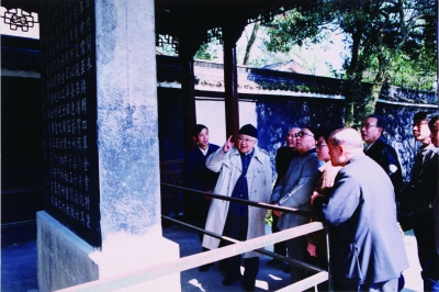大家随专家们来到园内御碑亭前,启功先生驻足凝望碑文,逐句逐段解读乾隆皇帝所作《趣亭》、《月台》、《文澜阁》三首诗和赐赠文澜阁四库全书的上喻,还对碑文恭录者,当时浙江巡抚谭钟麟的欧、柳两体书法做了介绍,给我们这些青年人上了一堂生动的古典文学和书法课,让我们受益匪浅,启功先生传授学问的同时伴随言语特有的幽默,不时引起大家的笑声,大家无不为先生的魅力所吸引着,一刹时,大家忘记了眼前的风景、古迹,淡化了身边的奇花异石,都紧紧地簇拥着他。