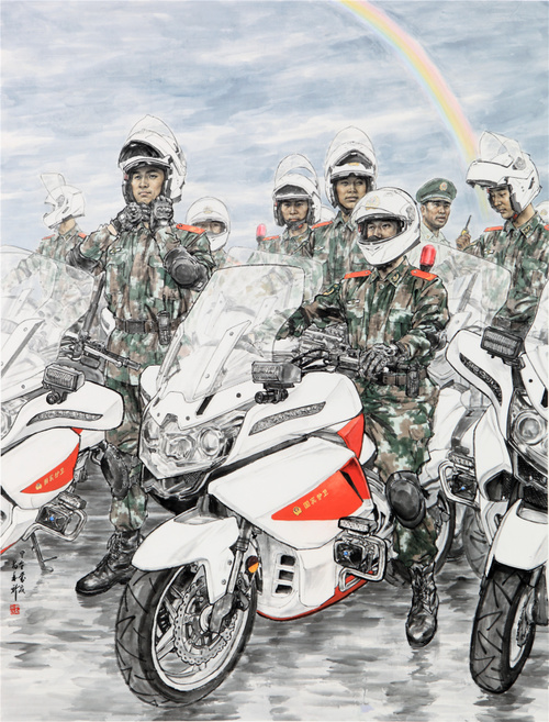 文学艺术都是人类社会实践反映的产物,因此随着时代的变幻与前进而不断发展。他锐意进取,寻找当下的语言表达方式,在守成和开创中保持理性的研究状态。作为军旅画家,配合时事与政策,用画笔关注社会、关注人生,把握时代变迁的脉搏,表现当下的现状和生活始终是他创作中的一条主线。因而其作品更具现实意义,他以可视的当代性,反映了中国社会各个时期与层面的变化和真实写照。因此,他的作品对于需要不断创新探索的中国画来说,将具有深远的启示意义。