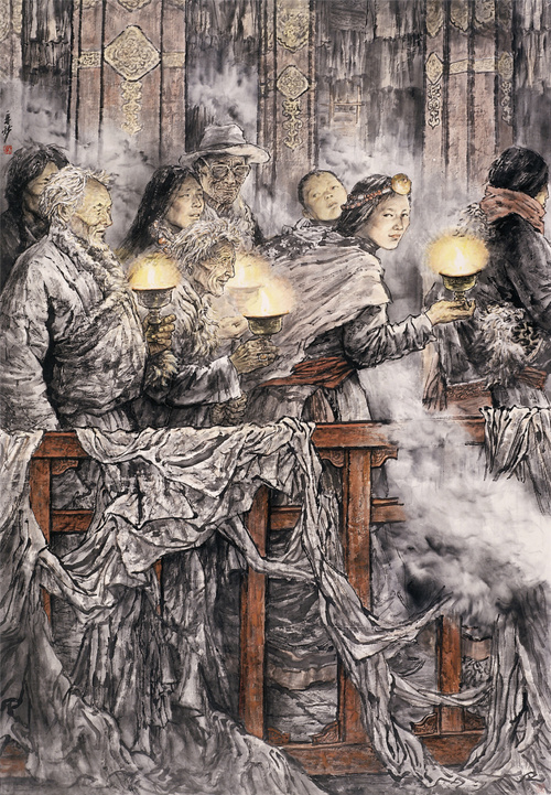 在苗再新先生的这类作品中人物形象神情真实鲜活,视觉冲击力很强,充满正气和激情,没有往过分理想化去唯美塑造的矫揉造作。这源于他根植于内心的文化体悟,才使绘画中散发出来的气息和力量传达出一种强烈的生命之美,也是他本然的感悟和自然而然的情感流露,仿佛朝圣者的灵魂,带着掩盖不住的光辉。正是这一份真实的生动,才使他笔下的人物有一种直抵观者内心深处的力量,观之令人动容,涤荡我们常常无动于衷的心灵。