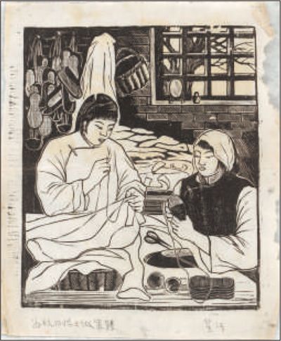 为抗日将士做军鞋(版画)