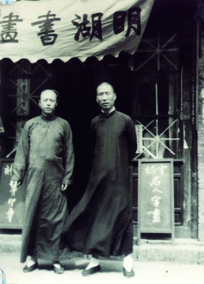一九四二年四月二日至四日在济南普利门外青年会举办展览时门前留影(左为李苦禅)