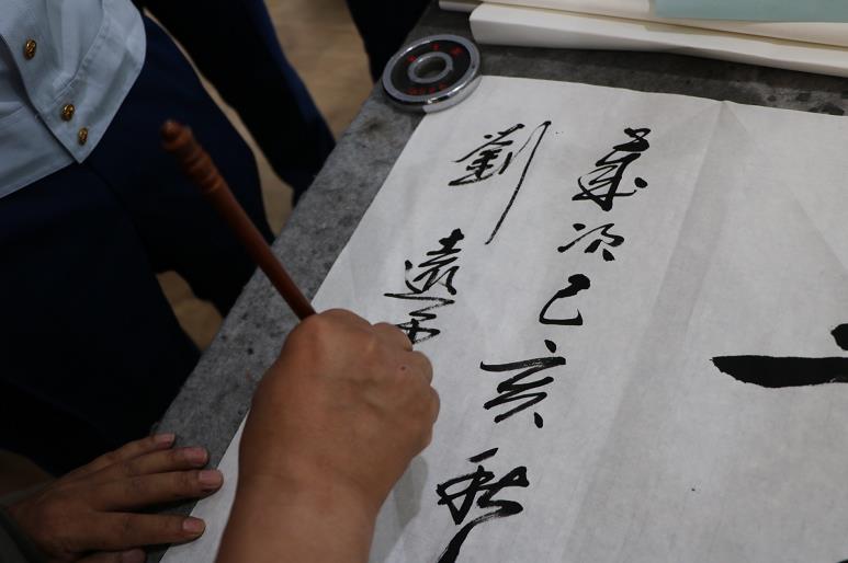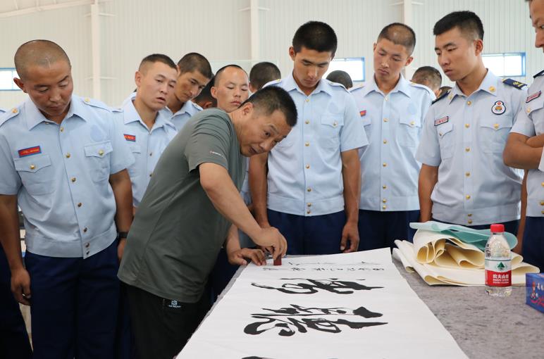 随着书法老师的运笔,充满寓意的励志语言跃然纸上。活动中,各位老师毫无保留的挥毫献艺,将一幅幅作品送给和平时期“最可爱的人”,全体指战员围在艺术家身边,近距离观摩书法家创作,并和书法家交流书法创作心得,一幅幅功力深厚、饱含艺术魅力的书法作品赢得了在场指战员们的连声赞誉。