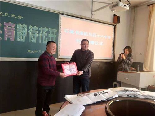 捐赠仪式上,书画院领导上前进行捐赠,四十六中领导接受捐赠。四十六中领导还向石城书画院领导颁发了收藏证书,再次感谢书画院各位艺术家。