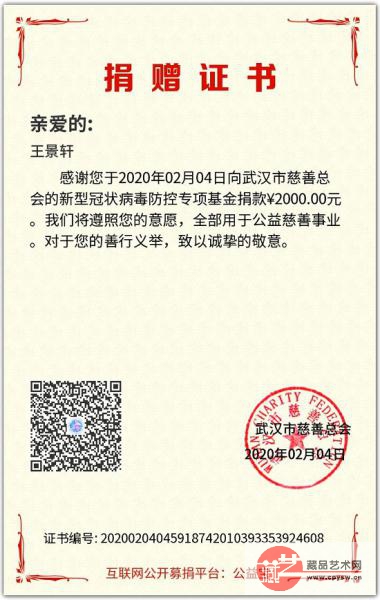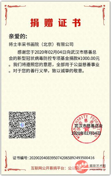 作者:黄再寿将军 “同舟共济 武汉加油”新型肺炎疫情 牵动着社会各界的心,面对当前严峻形势,将士丰采书画院积极组织将军、老兵书画家、军旅书画家等挥毫创作,宣传抗疫精神,讴歌防疫英雄,鼓舞士气,弘扬正能量,并向武汉市慈善总会捐款1000元,为疫情防控工作助力鼓劲! 2020年2月4日,将士丰采书画院法人、执行院长兼秘书长王景轩以书画院名义捐款 2020年2月4日,将士丰采书画院法人、执行院长兼秘书长王景轩以个人名义捐款