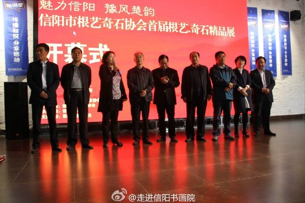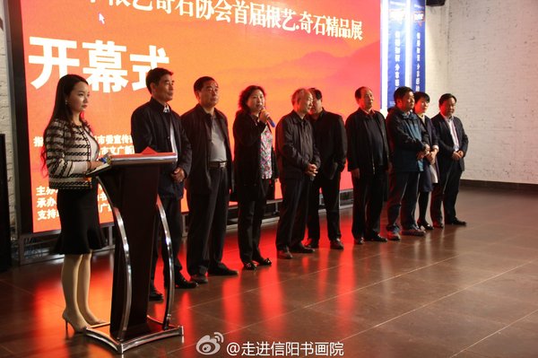 出席本次展览开幕式的嘉宾有:原市委常委、宣传部长、信阳关工委执行主任钟家智、原信阳市政协副主席廖长明、信阳市关工委副主任罗光辉、市委宣传部常务副部长刘学军、信阳文广新局组委书记、局长张冬梅、信阳市文联主席殷丽、信阳市浉河区宣传部部长陈信胜、信阳市浉河区宣传部副部长汤红涛、河南省根雕艺术协会会长靳佃三、信阳文化产业协会会长熊心宏、信阳市根艺奇石协会会长周厚安等。根艺馆馆长周厚安致辞:信阳市首届根雕奇石展正式开始。