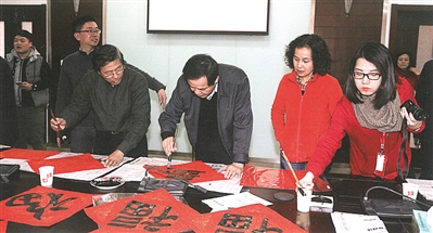 2016年新春期间,书画院常务副院长张培基带领书画院特聘画师连续三次开展迎新送“福”送文化下基层活动,到达石门二路街道、长宁区民俗文化中心、闵行区颛桥居民区,为居民送“福”写春联。
