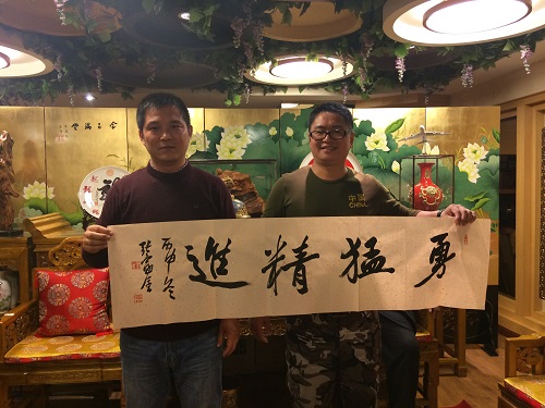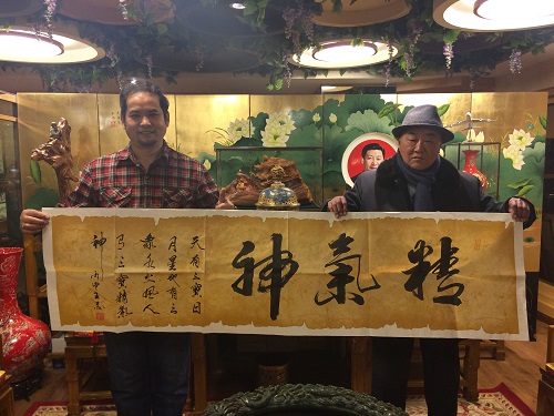 乐天汇书画院院长、书法家王志(左)的作品“精气神”被国家荒漠化基金会顾问李广华先生(右)收藏