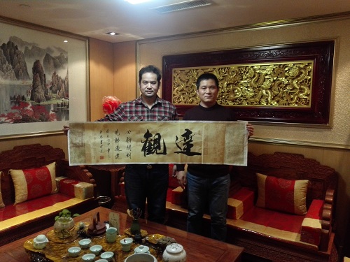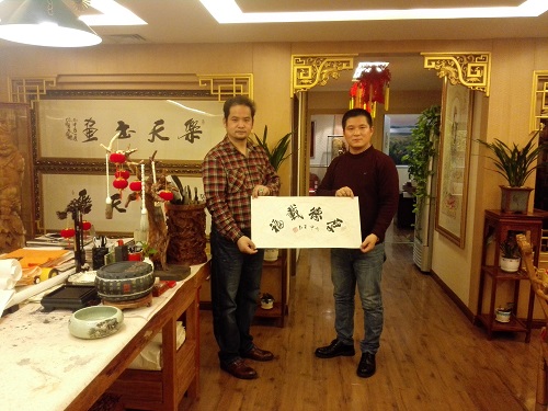 乐天汇书画院院长王志(左)作品“厚德载福”被藏品艺术网执行主编王骊丁(右)收藏