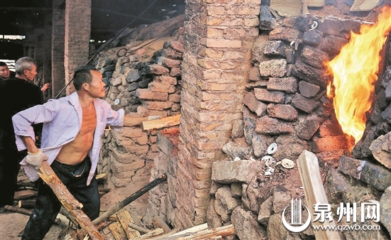 2月2日,泉州天气持续阴冷,德化高山地区气温已经降至冰点。冰火两重天,德化三班镇蔡径村的烧瓷窑工却大汗淋漓,甚至袒胸露臂,在热浪袭人的柴烧龙窑月记窑前烧制瓷器。月记窑薪火相传,至今已有四百年以上的烧瓷历史,是德化对外展示陶瓷历史文化的重要窗口。图为窑工们在烧制辞旧迎新的鸡年最后一炉瓷器。当天傍晚该窑熄火停工。 (徐艺星 摄影报道)
