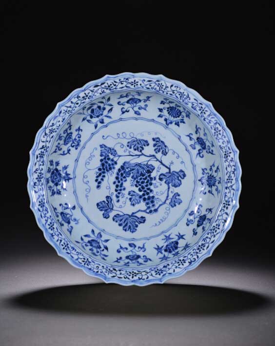 永乐青花盘以三十公分者为常,四十公分者为贵,而四十公分以上者,世间罕有,为世界公私收藏中国陶瓷机构竞相争夺的至宝。就永乐青花纹饰而论,『五朵花』不若『一束莲』,莲不若牡丹、扁菊,而花卉又不若西瓜、葡萄……此件“永乐青花葡萄纹花口大盘”口沿及器壁呈十二瓣菱花式,形如盛开的莲花。撇口宽折沿、唇口凸起、浅弧壁、广底、圈足,平砂底,无釉。通体青花纹饰,盘心绘折枝葡萄,枝叶翻卷,藤蔓缠绕,硕果累累;外壁饰灵芝、牡丹、菊花等十二组折枝花卉;口沿饰缠枝花卉纹一周。所绘花纹匀称分布,藤蔓绵绵,疏朗而饱满,纹饰写实传神,充分借鉴国画的笔墨意韵,得其法度,勾、勒、点、染诸法,运用皆宜。线条粗细并用,青料浓淡兼施,呈色极富层次,铁锈斑深入胎骨,从而令画面颇具苍翠欲滴的意趣,透出凝重雄浑之美,一如朱明盛世,清廉为政的治国之道。永乐青花纹饰明显地较元代疏朗,描绘手法趋于自然、写实。诸如此类的“花口巨盘”绘葡萄纹饰,明显带阿拉伯风情,应是为出口中东专门烧製的,极有可能是为当时波斯皇族,土耳其的帝王,又或是西亚的君主们定制之物。此可从现存土耳其托普卡匹博物馆和德黑兰阿德比尔圣庙等海外收藏的珍贵永乐大盘得证。