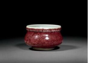 清代康熙时,著名督窑官郎廷极,在瓷都景德镇龙珠阁御窑厂用铜红釉仿照明朝永乐,宣德二代精美红釉瓷器,烧制出又一新品种,获得巨大成功,使铜红釉烧得更加出色。从此,自明朝中期铜红釉烧造失传的技术,在200年后的康熙朝重新获得了生产,并且各方面都有进一步的发展。后人为纪念其功绩,并把其窑产品以姓氏名义加以称誉,史称“郎窑”。这是一件郎窑红香炉,釉色莹澈浓艳,仿佛初凝的牛血那样猩红,时人又叫“牛血红”。它光亮夺目,极尽绚丽灿烂,釉面除了大片裂纹外,还有许多不规则的牛毛纹。其最大的特点是器物的口部呈淡白色,器物底边由于釉质的流垂凝聚呈现红色。然而最妙最美的地方,在于釉挂在器物下方,像垂帘般不流至足底,底足泛黄,俗称“米汤底”,无款。人们往往鉴定其是否真品有“脱口垂足郎不流”之说。