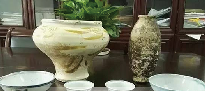 7月29日,在界首市某学校配电改造工程施工工地,工人在施工取土时,发现砖室墓。界首市文物部门接到群众电话后,立即赶赴现场。工程负责人主动将出土的青花杯、青花碗、白釉褐彩罐等6件陶瓷器交给文物部门。 该批瓷器瓷质优良,图案精美,保存完整。根据器型和图案等特征判断,为明代晚期出品,是近几年来界首市首次出土如此完好的一批瓷器,有着非常重要的收藏研究价值。