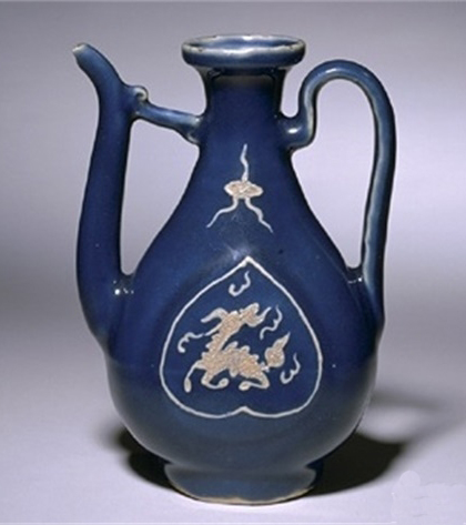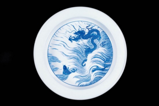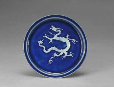 此盘折沿,浅壁,平底。通体内外施蓝釉,蓝釉地上以白色泥料塑贴一条矫健的白龙。龙细颈,三爪,作昂首翻腾状。此盘属于高温钴蓝釉瓷器,是元代景德镇窑的新品种之一,装饰方法有描金和用白泥堆贴龙、飞凤、海马纹等。饰有白龙纹的蓝釉器仅见于梅瓶和盘。