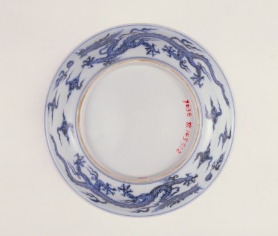 盘内壁与内底交接处暗划弦纹一周,有云纹三朵,呈“品”字形排列。内壁模印云龙纹。外壁以青花绘二云龙赶珠纹。龙纹笔触细腻,生动传神,承袭了元代及明洪武瓷器的作法。